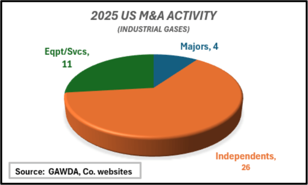 In recent years, large mergers and acquisitions (M&A) activity in the industrial gas industry has been constrained due to the market share positions of the majors. In 2025, the “top four global players” had announced between 12 and 14 acquisitions – largely “tuck-in”– in addition to a handful of divestitures.